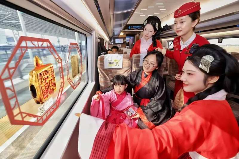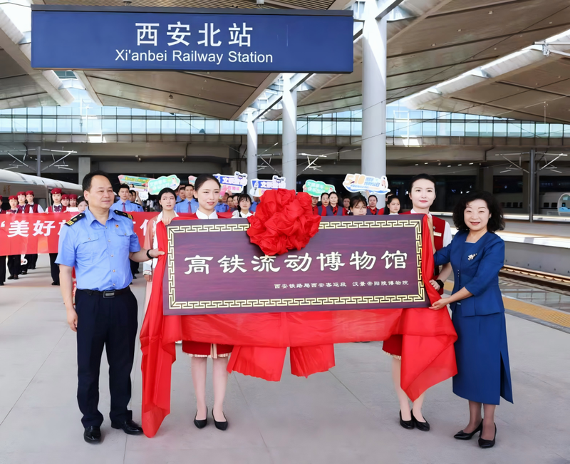 “流动的汉韵,行走的课堂——‘高铁流动博物馆’”系列教育项目由汉阳陵博物院与中国铁路西安局集团有限公司在2025年联合打造,以西安北往返香港西九龙的G916/G828次列车为主要载体,港澳跨境往返旅客为核心,同时辐射内陆各地旅客,分别打造港澳、暑期、传统节日三大系列专场。该项目立足汉文化资源精准对接港澳同胞文化认同需求,推出穿汉服·行汉礼·品汉茶、文物讲解·互动集章、沉浸式故事演绎、汉代体育游戏、非遗体验五大精品活动,打造出流动的“汉文化长廊”。首创全省文博系统“高铁流动博物馆”教育模式、文博资源与高铁交通网络的跨界合作机制与汉文化专属车厢场景,累计服务旅客十万余人次,并获得新华社、人民日报、中国新闻网等20余家中央、省市级主流媒体报道。其中,人民日报在专题报道中将本项目作为全国文化主题列车的典型范例,充分肯定汉阳陵在文物活化利用与文化传播方式上的创新价值与示范意义。