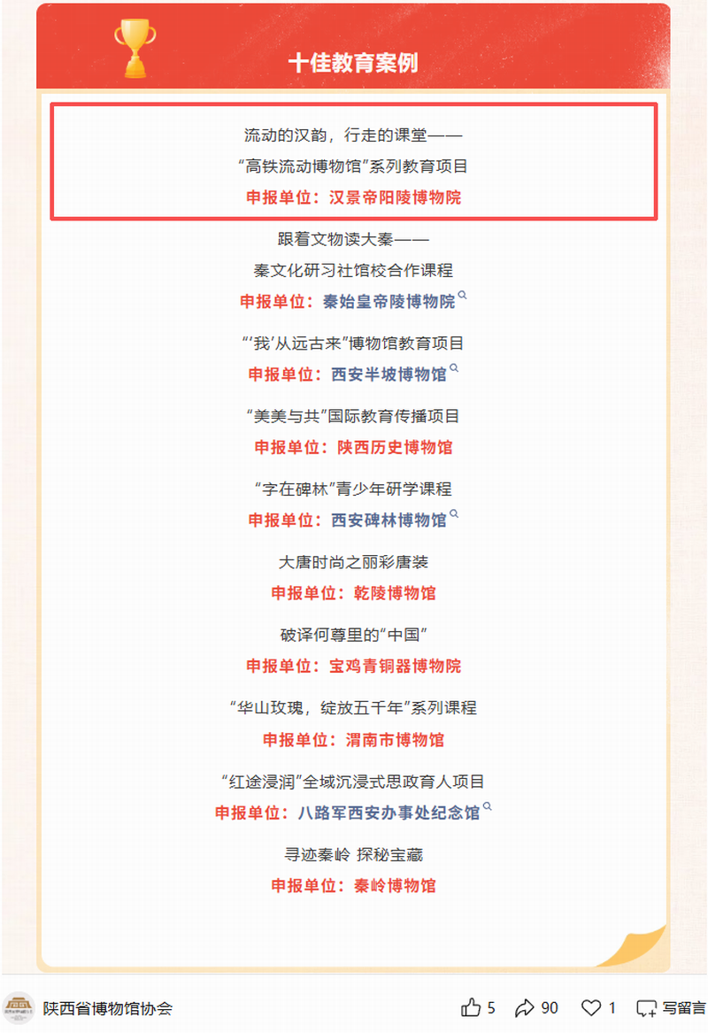 2月5日,由陕西省文物局指导,陕西省博物馆协会主办,陕西省博物馆协会社会教育专业委员会承办,汉景帝阳陵博物院协办的“十四五”陕西省博物馆十佳教育案例推介活动终评结果揭晓,汉景帝阳陵博物院“流动的汉韵,行走的课堂——‘高铁流动博物馆’”系列教育项目获评十佳教育案例。