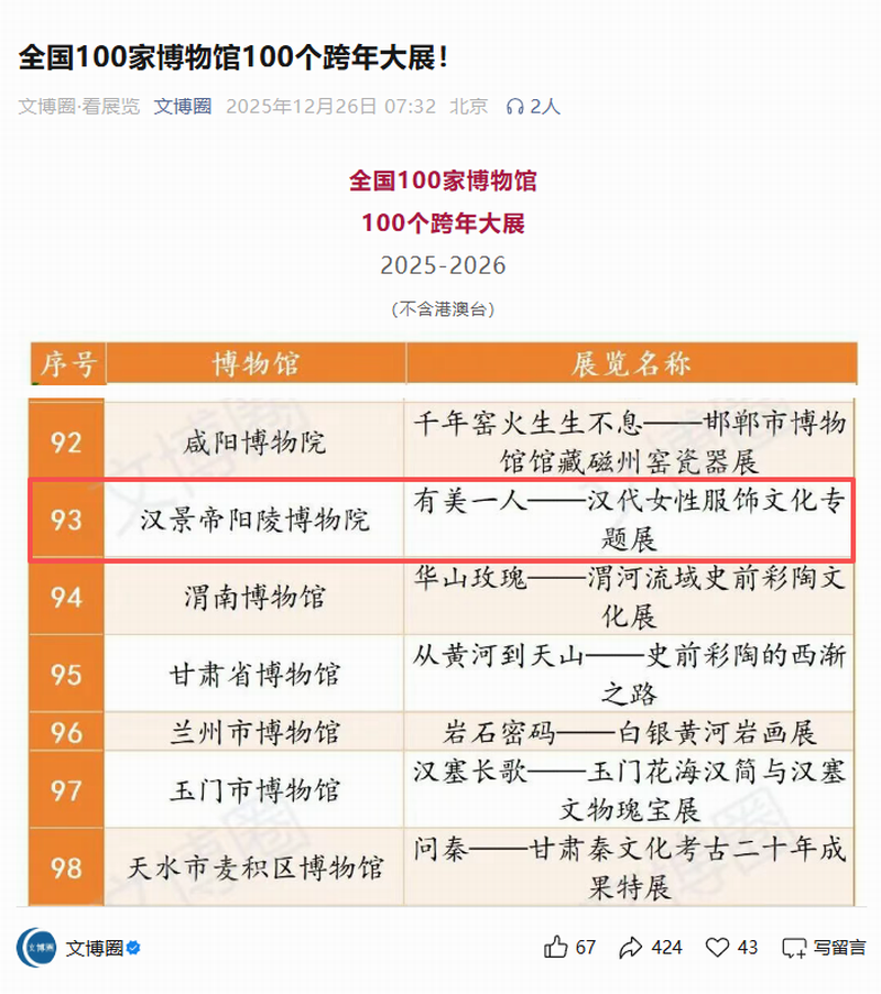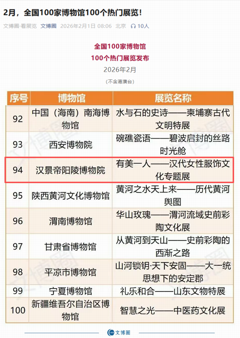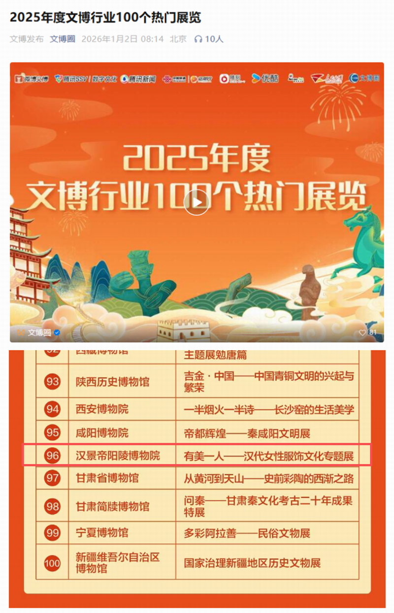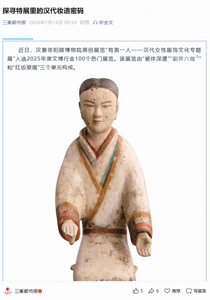 汉景帝阳陵博物院原创临展“有美一人——汉代女性服饰文化专题展”,相继入选“2025年年度文博行业100个热门展览”“全国100家博物馆100个跨年大展”,2026年新春假期、2、3月“全国100家博物馆100个热门展览”等荣誉榜单。